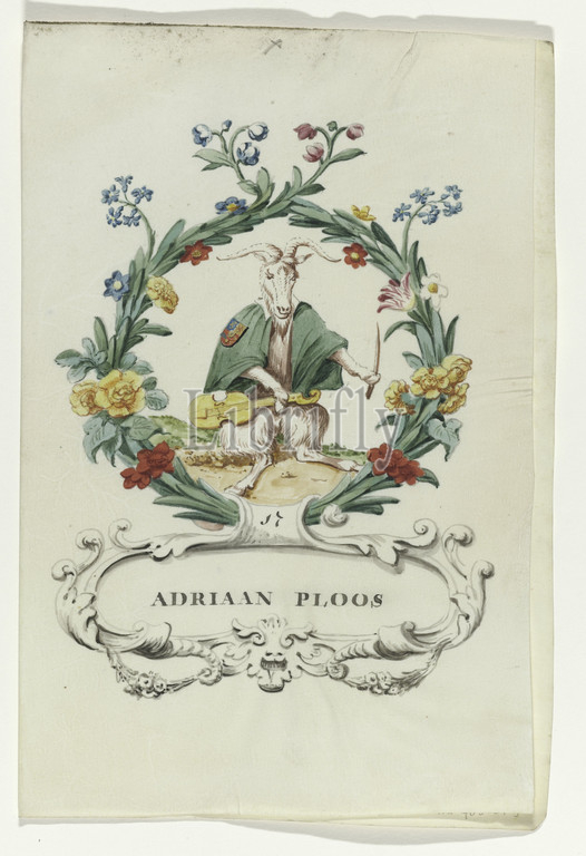 Cartoon, Adriaan Ploos Regtspleging, Oldenbarnevelt, series title, Adriaan Ploos, judge, Van Oldenbarnevelt, sitting goat, violin, cloak, weapon, wreath, flowers, leaves, cartouche, name, no, 17, Associated, series, watercolors, book, Johan van Oldenbarnevelt, Netherlands, 1708, 1795, parchment, animal material, watercolor, paint, ink, pen