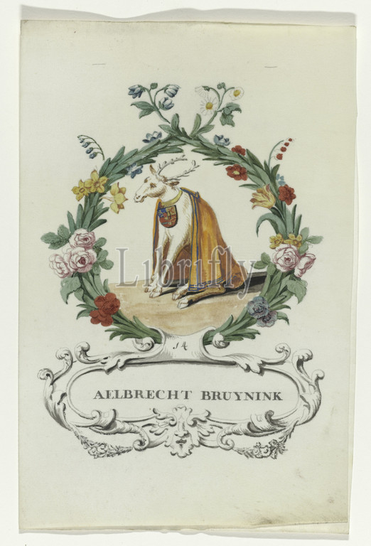 Cartoon by Aelbrecht Bruynink Regtlegleging by Oldenbarnevelt (series title), Cartoon by Aelbrecht Bruynink, judge by Van Oldenbarnevelt, deer with antler and orange cloak with around his arms, in wreath of flowers and leaves. Below that is cartouche in which name and above no. 14. Associated with series of watercolors in book, Johan van Oldenbarnevelt, Aelbrecht Bruynink, anonymous, Netherlands, 1708 - 1795, parchment (animal material), watercolor (paint), ink, pen, h 23.5 cm × w 19 cm