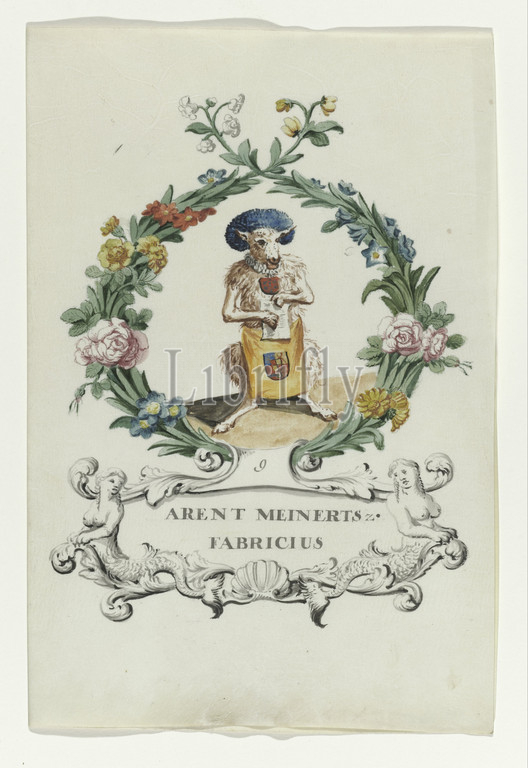 Cartoon by Arent Meinertsz. Fabricius Regtspleging by Oldenbarnevelt (series title), Cartoon by Arent Meinertsz. Fabricius, judge of Van Oldenbarnevelt, white sheep with blue fur hat and apron with arm in wreath of flowers and leaves. Below that is a cartouche with two mermaids on either side. In cartouche name and above no. 9. Associated with series of watercolors in book, Johan van Oldenbarnevelt, Arent Meyndertsz Fabricius, anonymous, Netherlands, 1708 - 1795, parchment (animal material), watercolor (paint), ink, pen, h 23.5 cm × w 19 cm