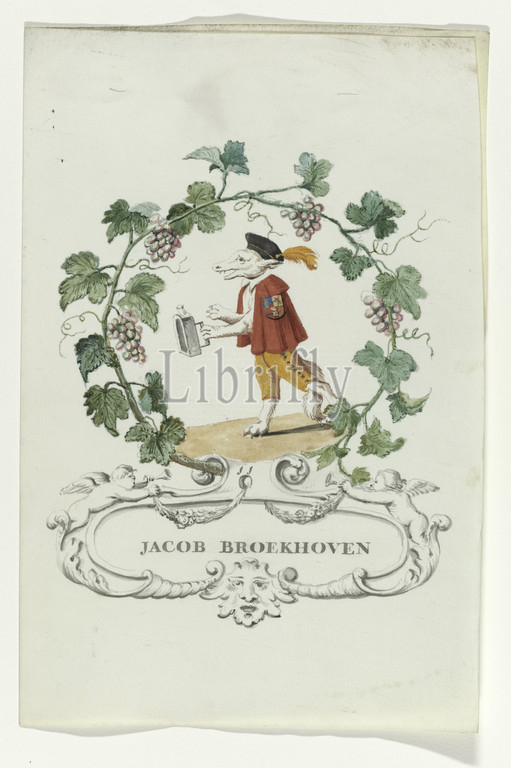 Cartoon, Jacob Broekhoven Regeling, Oldenbarnevelt, series title, Jacob Broekhoven, judge, Van Oldenbarnevelt, fox, orange shorts, cloak, coat, arms, bonnet, orange plume, wreath, grape vines, cartouche, two trumpet-blowing putti, side, cartouche name, no, 11, Associated, series, watercolors, book, Johan van Oldenbarnevelt, Jacob van Broekhoven, Netherlands, 1708, 1795, parchment, animal material, watercolor, paint, ink, pen