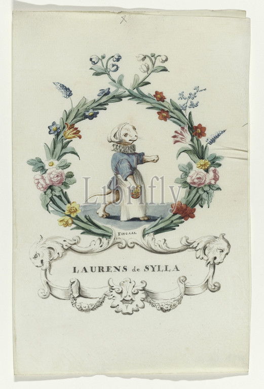 Cartoon by Laurens Sylla Regtspleging by Oldenbarnevelt (series title), Cartoon by Laurens Sylla, fiscal by Van Oldenbarnevelt, cat with collar, hat and apron with weapon in right hand. In wreath of flowers and leaves, underneath it a cartouche with a lion's head on the right. In the cartouche name and above that 'fiscal'. Associated with series of watercolors in book, Johan van Oldenbarnevelt, Laurens Sylla, anonymous, Netherlands, 1708 - 1795, parchment (animal material), watercolor (paint), ink, brush, h 23.5 cm × w 19 cm