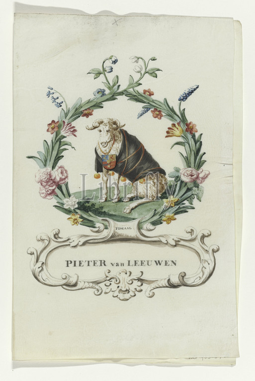Cartoon of Pieter van Leeuwen, fiscal Regtspleging of Oldenbarnevelt (series title), fiscal of Van Oldenbarnevelt, ram with black cover with orange apples. In wreath of flowers and leaves, with cartouche below in which name and above 'fiscal'. Associated with series of watercolors in book, Johan van Oldenbarnevelt, Pieter van Leeuwen, anonymous, Netherlands, 1708 - 1795, parchment (animal material), watercolor (paint), ink, brush, h 23.5 cm × w 19 cm