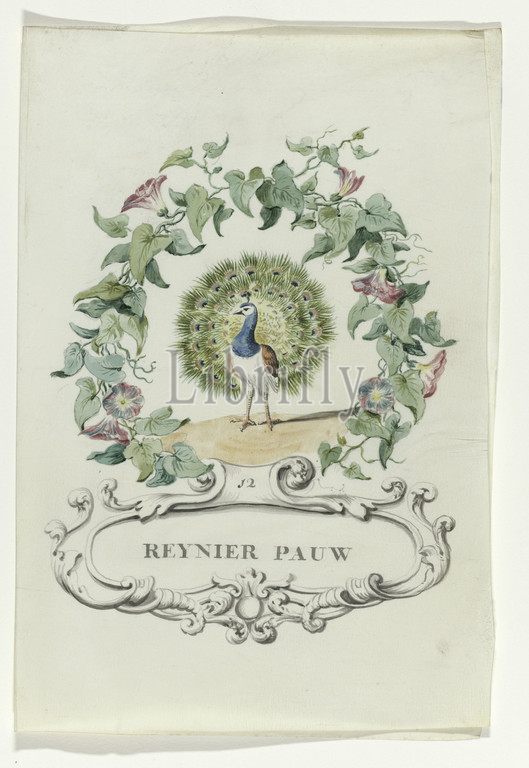 Cartoon, Reynier Pauw Regtspleging, Oldenbarnevelt, series title, Reynier Pauw, judge, Van Oldenbarnevelt, peacock, tail spread, wreath, flowers, leaves, cartouche, name, no, 12, Associated, series, watercolors, book, Johan van Oldenbarnevelt, Reinier Adriaensz, Peacock, Netherlands, 1708, 1795, parchment, animal material, watercolor, paint, ink, pen