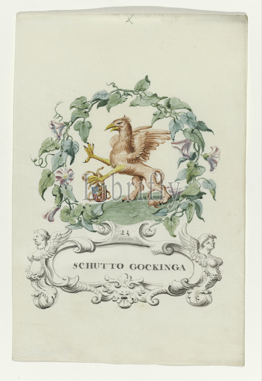 Cartoon, Schutto Gockinga Regtlegleg van Oldenbarnevelt, series title, Schutto, Scato, Gockinga, judge, Van Oldenbarnevelt, griffin, yellow beak, weapon, left leg, wreath, leaves, cartouche, two angels, sides, cartouche name, number 24, Associated, series, watercolors, book, Johan van Oldenbarnevelt, Scato Gockinga, Netherlands, 1708, 1795, parchment, animal material, watercolor, paint, ink, brush