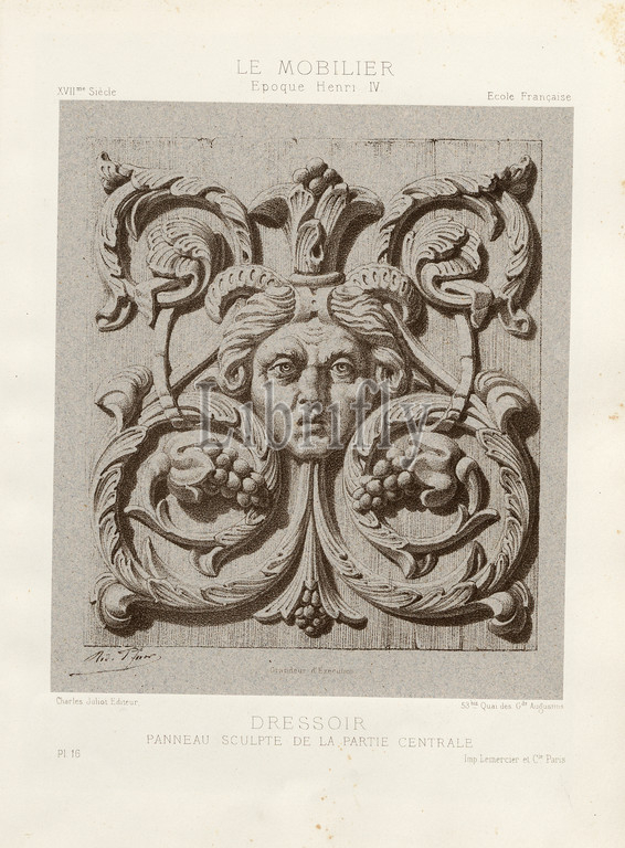 Carved panel, central part, 17th century furniture, Henri IV style, Signed, Rod., Pfnor, Charles Juliot Editeur, Imp. Lemercier et Cie, Pl. 16, p. 8, Rodolphe, del., Juliot, Charles, ed., Lemercier et Cie., imp., Rodolphe Pfnor, Le mobilier de la couronne, des grandes collections publiques, particulières du XIIIe siècle, XIXe siècle, mobilier civil, Mobilier religieux, Meubles, tentures, tapisseries, bronzes, objets d'art de toutes les époques accompagnés de dessins, grandeur d'exécution, Paris, Ch, Juliot, Editeur, Librairie Générale de L'Architecture, des Travaux Publics, 1874-1876