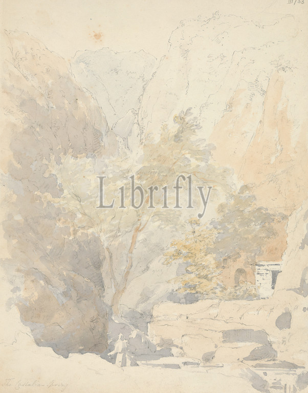 The Castalian Spring, Sir Robert Smirke the younger, 1781–1867, British, 1802-1804, Watercolor and graphite on moderately thick, moderately textured, beige, wove paper, Sheet: 11 3/8 × 8 15/16 inches (28.9 × 22.7 cm)