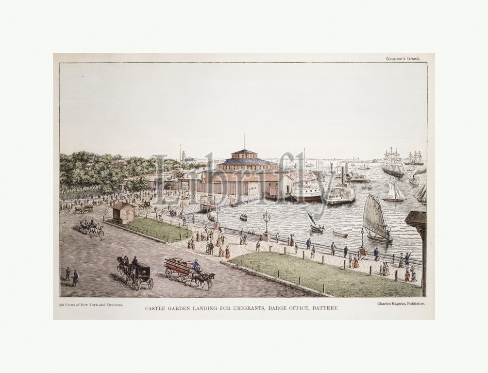 Castle Garden Landing, Emigrants, Barge Office, Battery, 1850–1900, Wood engraving, hand colored, 11 x 8 9/16, 28 21.7 cm, Prints