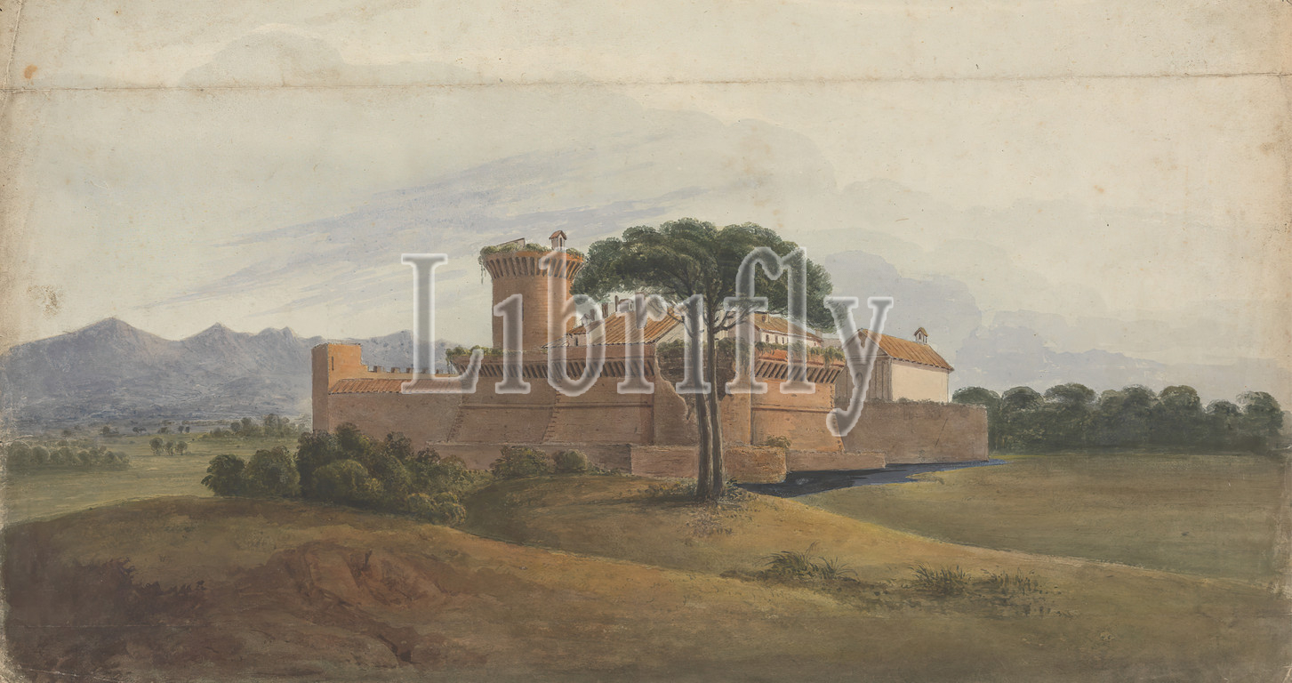 Castle of Ostia with Mountains in the Distance, Isaac Weld, 1774–1856, Irish, 1818, Watercolor, gouache, pen and brown ink, over graphite on medium, moderately textured, blued white, wove paper, Sheet: 10 7/16 x 19in. (26.5 x 48.3cm), Campagna