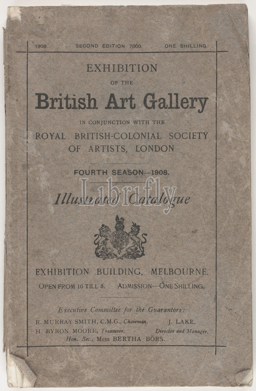 Catalogue, Exhibition, British Art Gallery, Melbourne, 1908, Illustrated catalogue produced, Fourth Season, British Art Gallery' held, conjunction, Royal British-Colonial Society, Artists, London, Exhibition Buildings, catalogue, compiled, edited, J Lake, contained notes, pictures exhibited, 80 illustrations