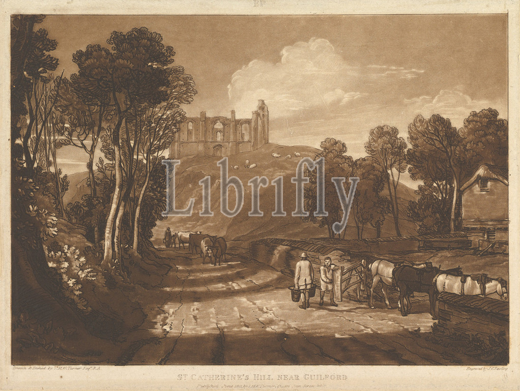St, Catharine, Hill, Guilford, Liber Studiorum, part VII, plate 33, June 1811, Etching, mezzotint, third state, three, plate, 7 3/8 x 10 7/16, 18.7 26.5 cm, Prints, Designed and etched by Joseph Mallord William Turner, British, London, 1775–1851, Turner distilled, ideas, landscape, Latin, Book, Studies, series, seventy prints, plus, frontispiece published, 1807, 1819, establish, compositions, brown watercolor, drawings, etched outlines, copper plates