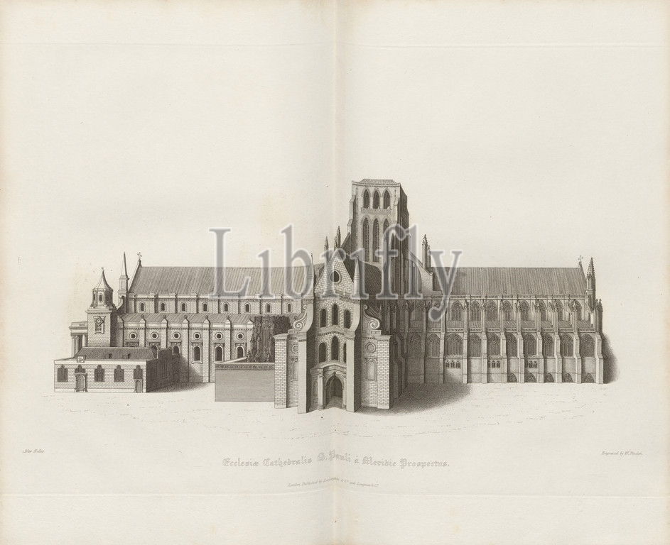 The Cathedral Church of St. Paul from noon prospect, Old St Paul's Cathedral in London, signed: After Hollar; Engraved by W. Find; Published by Lackington & Co. and Longman & Co., Pl. XXXVI, after p. 108, Hollar, Wenzel (drawing); Finden, W. (engraving); Lackington & Co (publ.); Longman & Co. (publ.), William Dugdale, Henry Ellis: The history of Saint Paul's Cathedral in London, from its foundation: extracted out of original charters, records, leiger-books, and other manuscripts. London: printed for Lackington, Hughes, Harding, Mavor, and Jones; and Longman, Hurst, Rees, Orme, and Brown, 1818