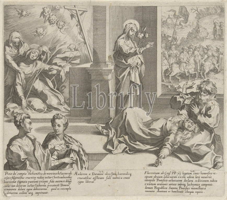 Catherine receives the stigmata of Christ / Catherine redeems a possessed of her demons / Pope Gregory XI returns to Italy, Scenes from the life and wonders of Saint Catherine of Siena (series title), Vita mors gesta, et miracula quaedam selecta B. CATHERINAE SENENSIS (...) (series title), Pieter de Jode (I), Italy, 1597, paper, engraving, h 255 mm × w 290 mm