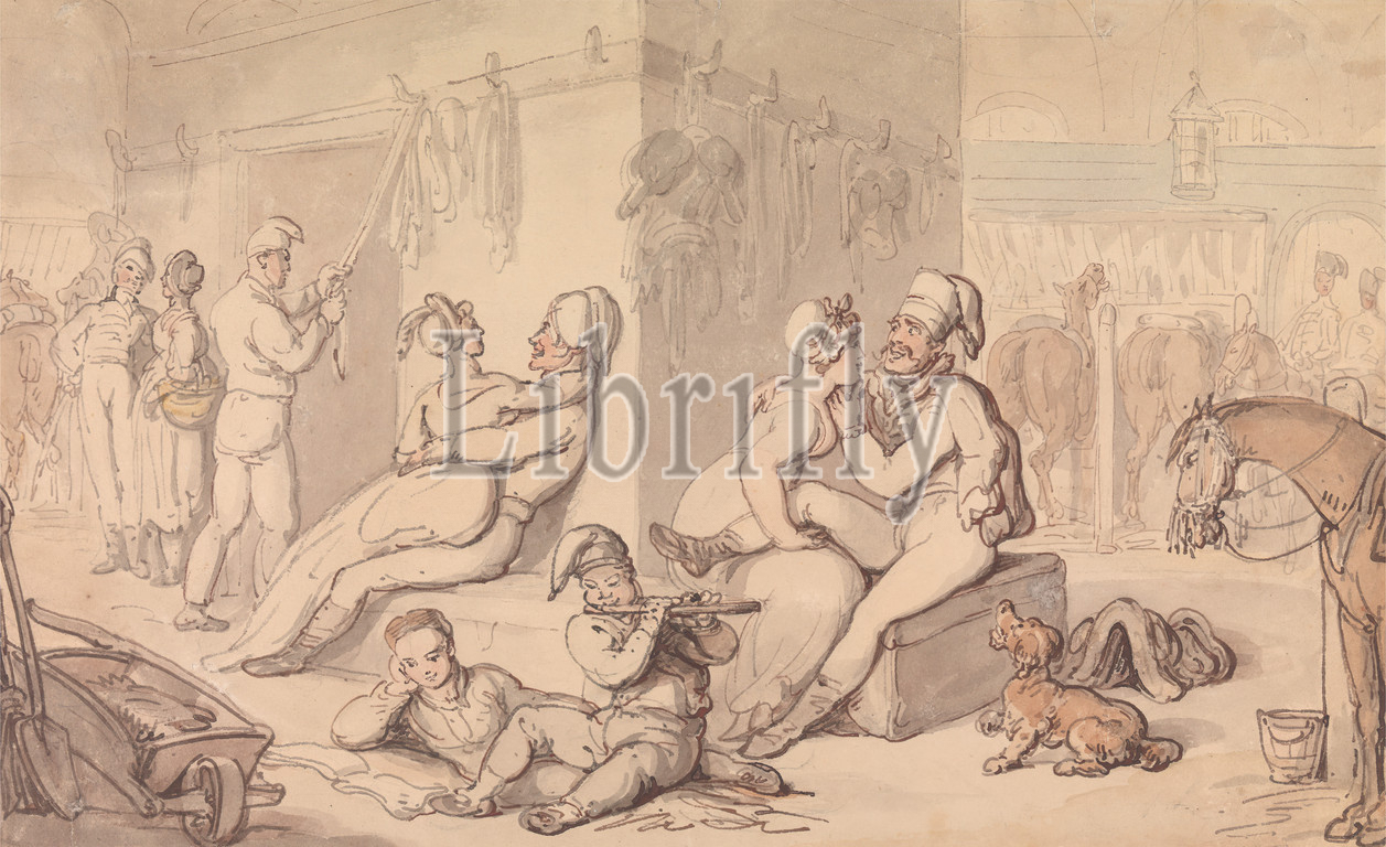 Cavalry Barracks, Thomas Rowlandson, 1756–1827, British, Watercolor, pen, red-brown, brown ink, graphite, medium, slightly textured, beige wove paper, Sheet, barracks, Box, boxes, containers, broom, cavalry, dogs, animals, flute, genre subject, horses, animals, men, stables, wagon, women
