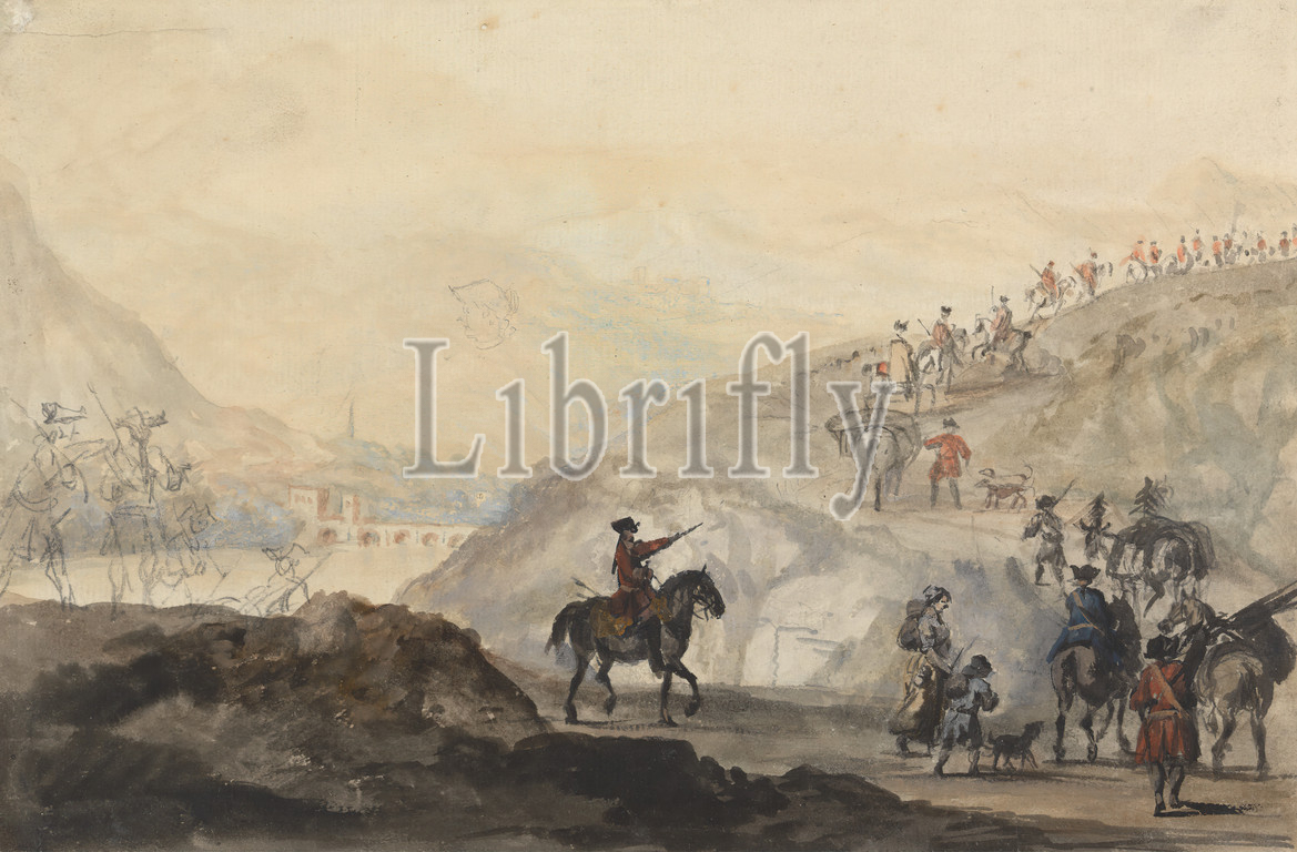 Cavalry Troops, Camp Followers, Move, Peter Tillemans, 1684–1734, Flemish, active, Britain, 1708, Watercolor, graphite, verso, gray wash, graphite, medium, slightly textured, cream laid paper, Sheet, cavalry, horses, animals, military art, people