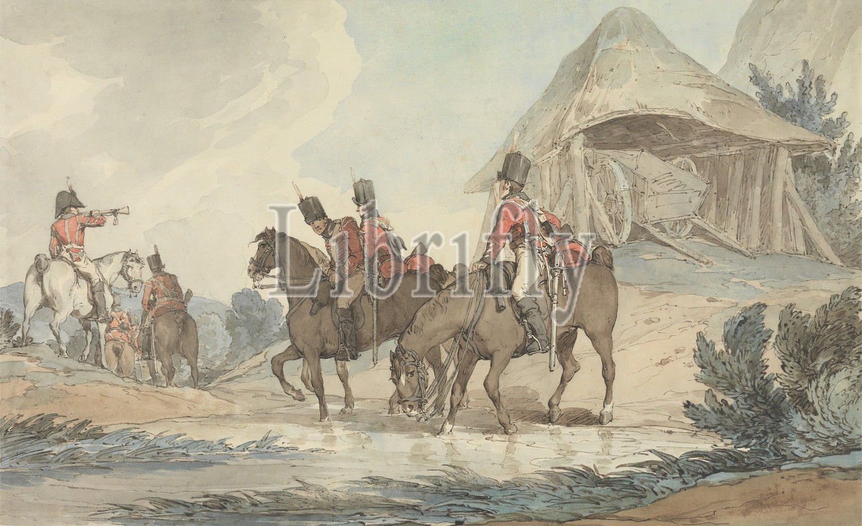 Cavalrymen Passing, Stream, Mustered, Trumpeter, John Augustus Atkinson, 1775–1831, British, Watercolor, pen, brown ink, pen, black ink, medium, slightly textured, cream wove paper, Sheet, cart, genre subject, horses, animals, river, soldiers, stream, trumpeter, uniforms
