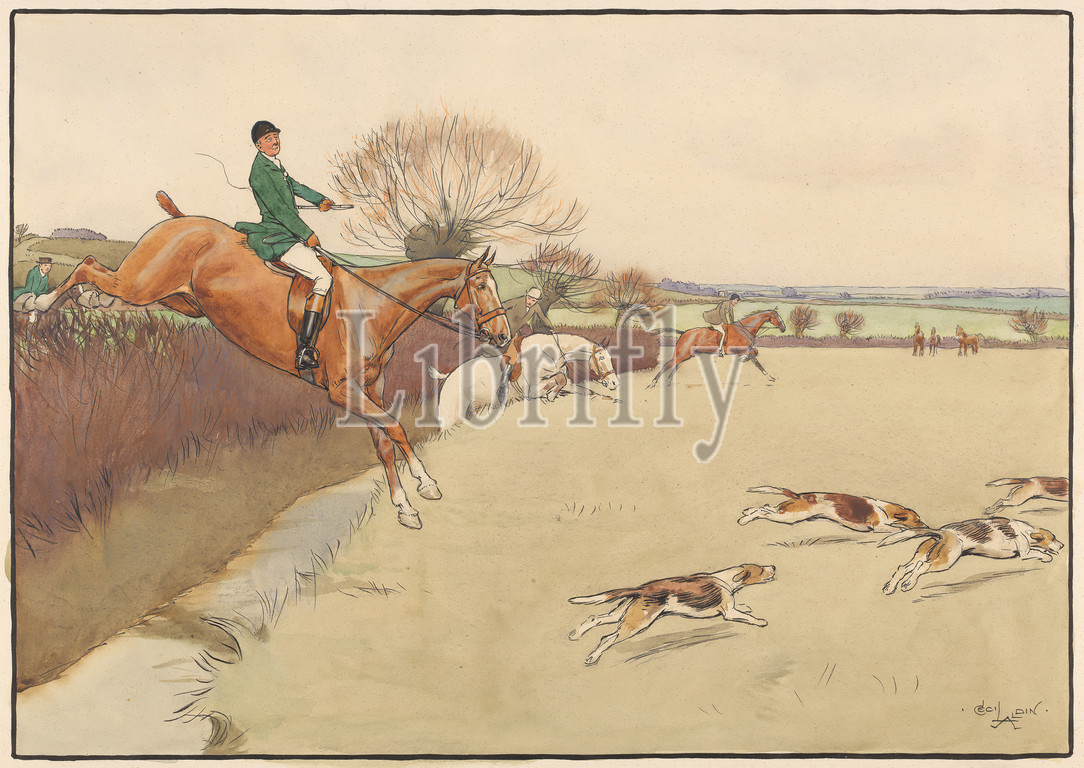 Up and Over, Cecil Charles Windsor Aldin, 1870–1935, British, undated, Watercolor, pen and black ink, graphite and gouache on moderately thick, slightly textured, cream, wove paper, Image: 9 13/16 × 13 15/16 inches (24.9 × 35.4 cm), Contemporary drawn border: 9 15/16 × 14 1/16 inches (25.2 × 35.7 cm), and Sheet: 10 5/8 × 14 1/2 inches (27 × 36.8 cm), dogs (animals), hedge, horseback riders, horseback riding, horses (animals), hounds (dogs), hunt, hunters, hunting, jumping, landscape, leaping, men, sporting art, tree