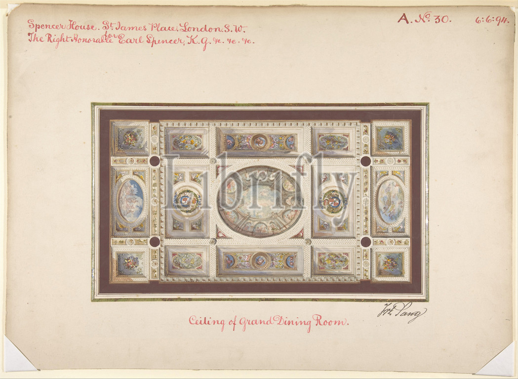 Ceiling, Dining Room, Spencer House, St, James Palace, London, 1870, ca, Watercolor, graphite, sheet, 7 1/16 x 11 3/4, 17.9 29.8 cm, Frederick Sang, British, active, 1868–70
