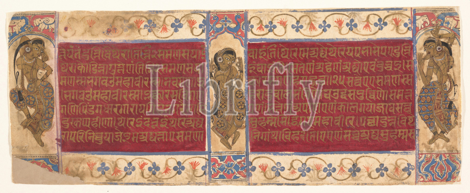 Celestial Performers, Folios, Kalpasutra Manuscript, ca, 1490, India, Gujarat, Ink, opaque watercolor, paper, Overall, 4 1/2 x 11 1/2, 11.4 29.2 cm, Paintings, Jain, cosmology, Shakra, heaven, blissful place, jinas reside, eternity, populated, celestial dancers, beautiful maidens, sensuously, poised, text margins, scenes, echoed, textual descriptions, celebrating, Mahavira