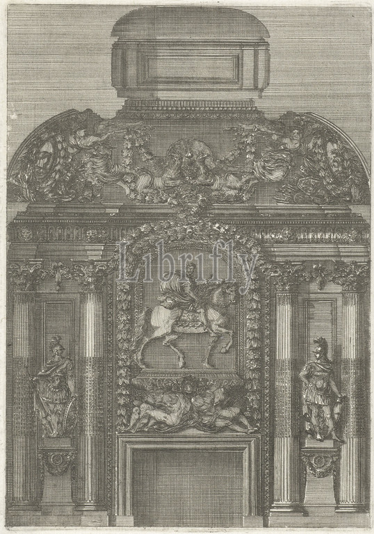 In the centre, a horseman is depicted above two bound slaves, recessed Corinthian columns with the statue of a Roman general in between. From series of 12 sheets, Chimney atrium (series title), print maker: Jean Lepautre, Jean Lepautre, publisher: Jean Leblond (I), print maker: France, (possibly), France, (possibly), publisher: Paris, c. 1651, paper, etching, h 193 mm × w 135 mm