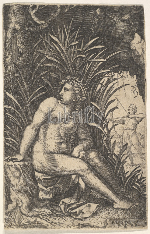 Cephalus and Procris: Procris turns her head over her right shoulder while seated nude in a thicket, Cephalus draws an arrow with a bow beyond, from a series of four mythological scenes, 1539, Engraving, sheet: 4 11/16 x 3 in. (11.9 x 7.6 cm), Prints, Georg Pencz (German, Wroclaw ca. 1500–1550 Leipzig)
