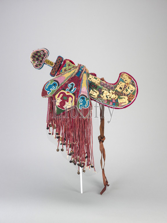 ceremonial sword and sheath, Owo people, late 19th century - early 20th century, glass beads, cloth, ivory, iron, approximately. L:18 in. (sword in sheath), approximately L:26 in. (with hanging elements), African Art