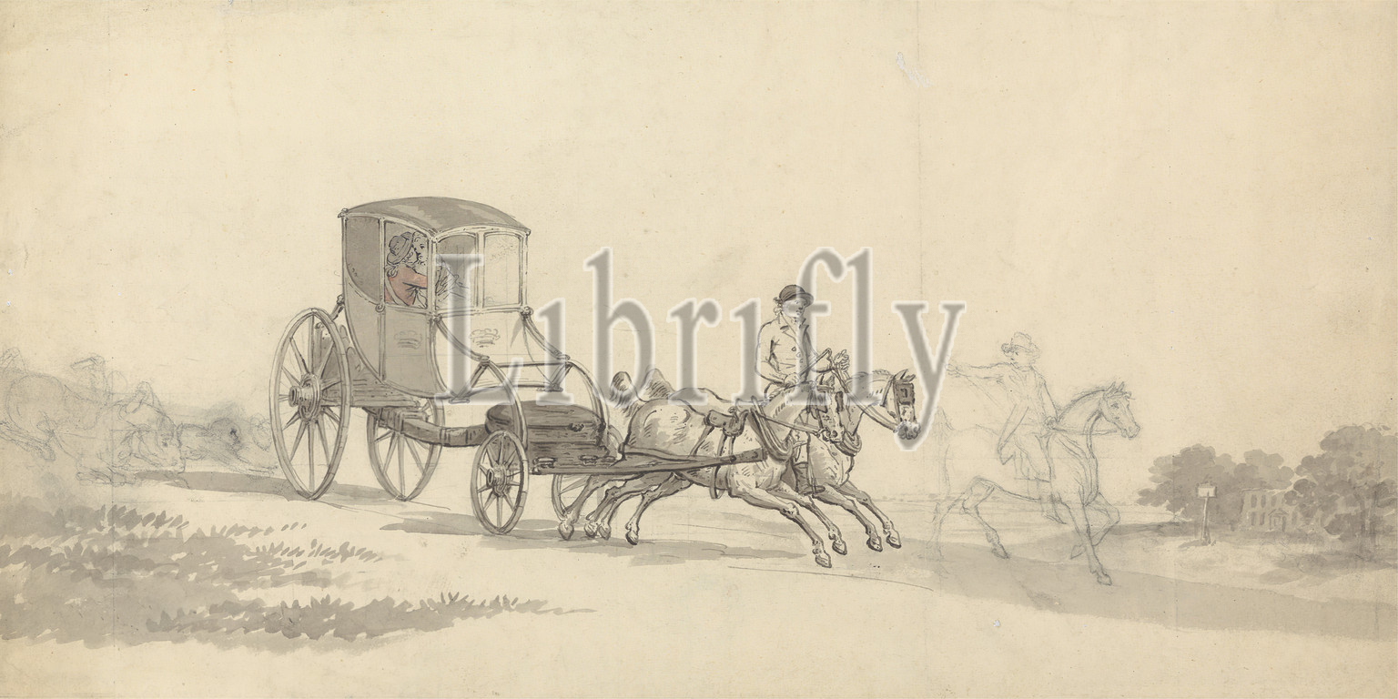 Chaise, Pair, Post-Boy, Samuel Howitt, 1756–1822, British, Pen, gray ink, black ink, gray wash, graphite, watercolor, medium, slightly textured, blued white, wove paper, Sheet, boy, chaise, genre subject, horses, animals, landscape, men, pair, women