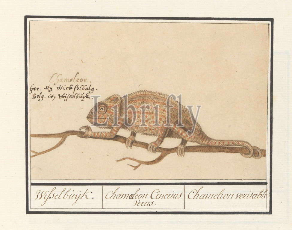 Chameleon, Chamaeleonidae, Wisselbuijk, Chamaeleon Cinerius Verus, Chamelion veritable, title, object, Left, name, three languages, Part, seventh album, drawings, reptiles, amphibians, natural history ensembles, seventh, twelve albums, watercolors, animals, birds, plants, 1600, commissioned, Emperor Rudolf II, explanations, Dutch, Latin, French, lizards, chameleon, Anselmus Boetius de Boodt, Praag, 1596, 1610, paper, pencil, chalk, watercolor, paint, ink, pen