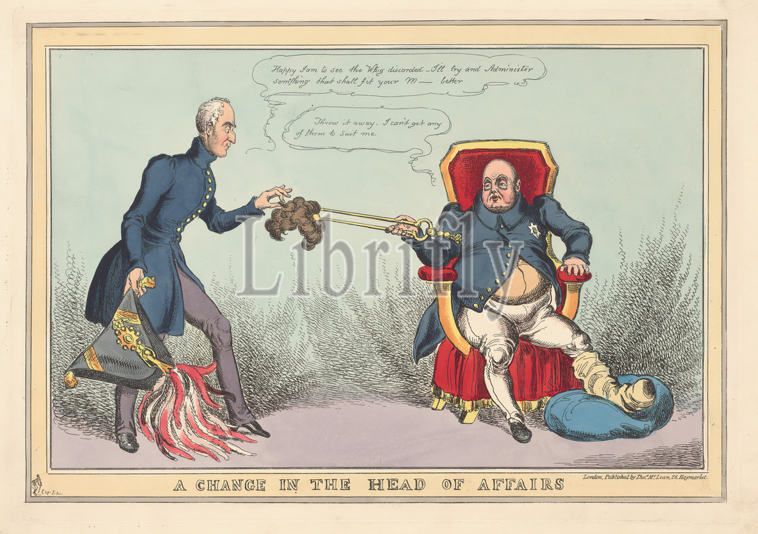 A Change in the Head of Affairs, Print made by William Heath, 1795–1840, British, Published by Thomas McLean, 1788–1875, British, ca. 1828, Etching with hand coloring in watercolor on moderately thick, slightly textured, cream wove paper, Sheet: 11 3/8 × 17 1/4 inches (28.9 × 43.8 cm), Plate: 10 3/8 × 14 3/4 inches (26.4 × 37.5 cm), and Image: 8 1/2 × 13 1/8 inches (21.6 × 33.3 cm)
