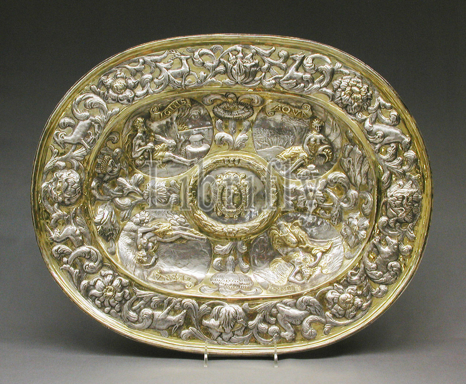 Charger, 1694, Hungarian, Transylvania, Silver, partly gilded, Overall, 17 1/8 x 17 1/2, 43.5 44.5 cm, Metalwork-Silver, Allegorical figures, Four Elements, labeled within, ribbons, IGNIS, fire, AQUA, water, AER, air, TERRA, earth, occupy, oval cartouches, Cycles, Seasons, Times, Day, Ages, Man, important, commonly depicted, subjects, Baroque art