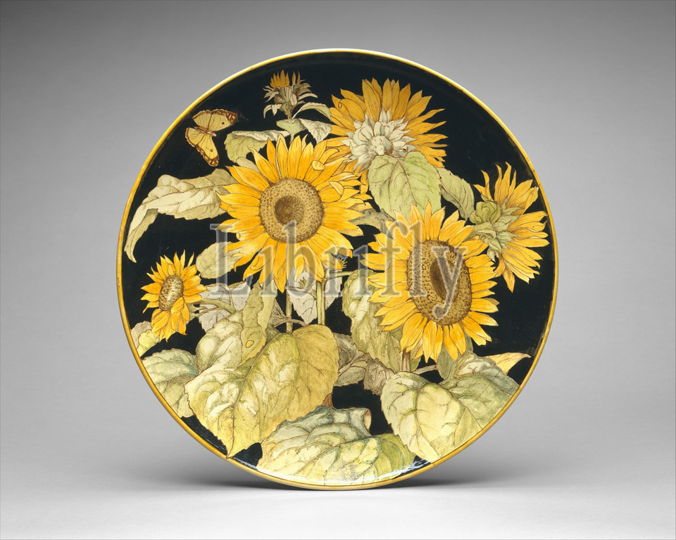 Charger, 1876, British, Earthenware, Diameter, 20 7/16, 51.9 cm, Ceramics-Pottery, F. Gadesden, large, dish, decorated, six sunflowers, depicted, different stages, maturity, bud, fully opened, bloom, sunflower, popular motif, within, Aesthetic Movement, embraced, concept, art should, exist, solely, own sake, sunflowers, frequently, ceramics, furniture, metalwork, last quarter, nineteenth century