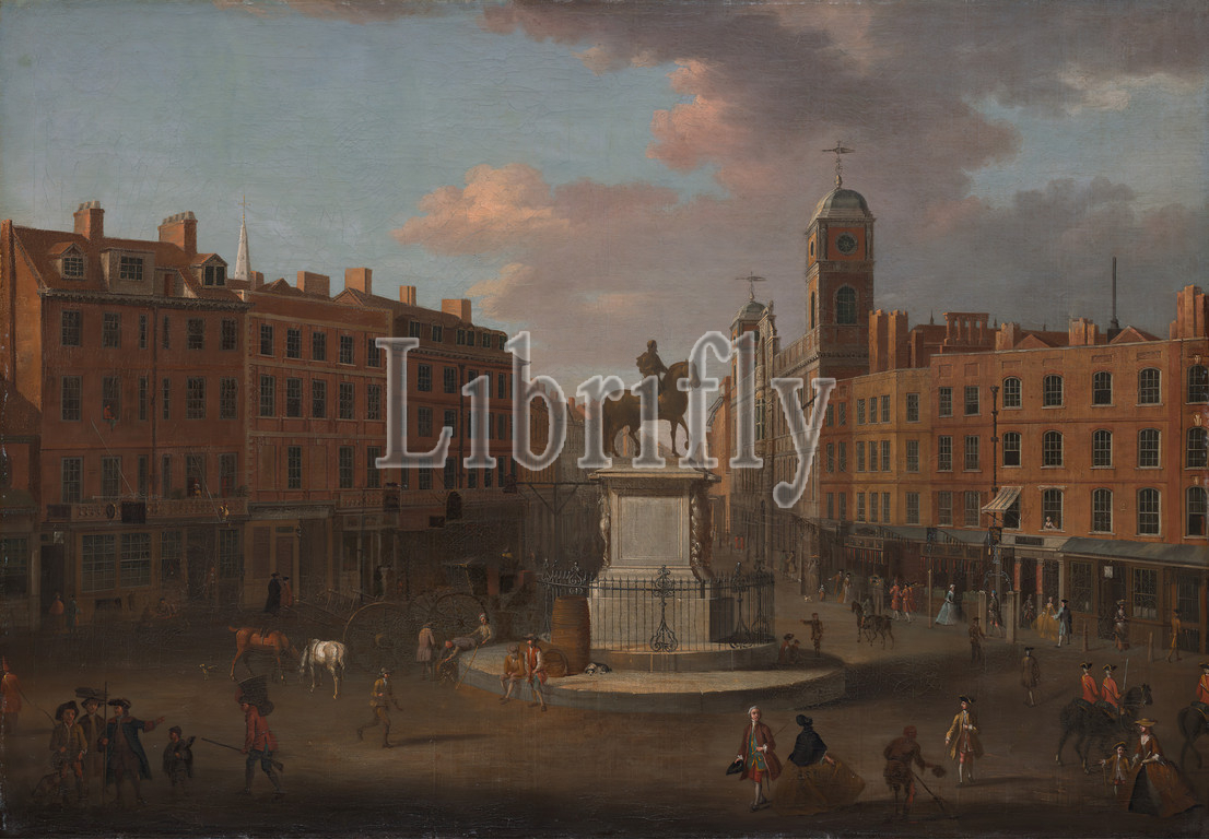 Charing Cross, Statue, King Charles I, Northumberland House, Joseph Nickolls, active 1713–ca, 1755, British, ca, 1750, Oil, canvas, Support, PTG, architectural subject, beggar, buildings, carriages, carts, children, cityscape, costume, equestrian statue, fence, genre subject, horses, animals, houses, king, person, men, shops, square, statue, street, walking, women, Charing Cross, England, Greater London, London, Northumberland House, United Kingdom