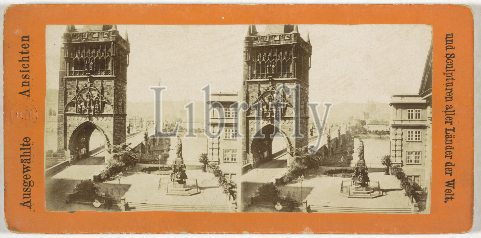 Charles Bridge, monument, Emperor Charles IV, Prag, Prag, Die Moldaubrücke u, statue Carls IV, Ausgewählte Ansichten und Sculpturen aller Länder der Welt, series title, O.J, mentioned, Praag, 1868, 1890, cardboard, paper, albumen print, height 86 mm, width 175 mm