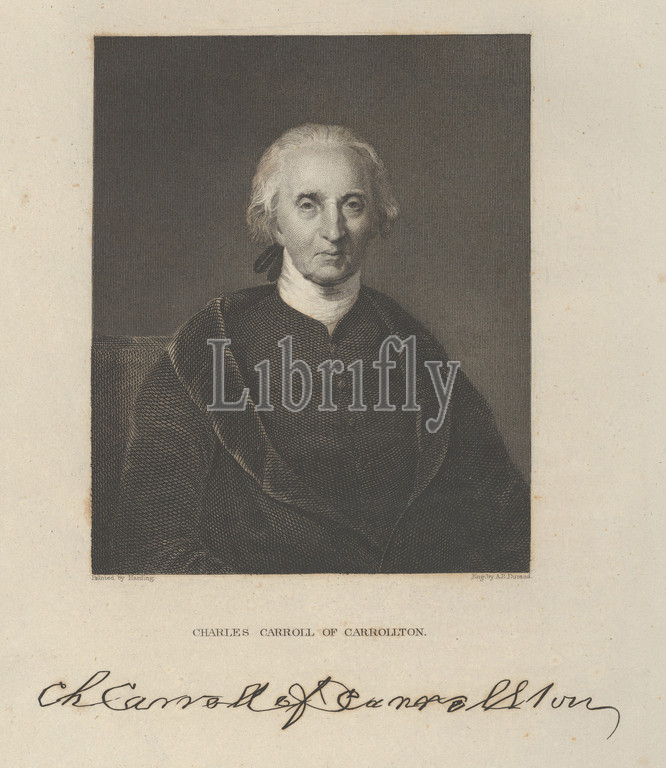 Charles Carroll, Carrollton, 1835, Engraving, third state, three, plate, 8 3/4 x 6 1/2, 22.2 16.5 cm, Prints, Asher Brown Durand, American, Jefferson, New Jersey, 1796–1886, Maplewood, After Chester, Charles, Harding, Conway, Massachusetts, 1792–1866, Boston, Durand portrays, leading figure, Maryland, supported independence, Britain, colonial period, served, delegate, Continental Congress, U.S, senator, Catholic signer, Declaration, Independence, longest-lived, dying, 1832, age, ninety-five