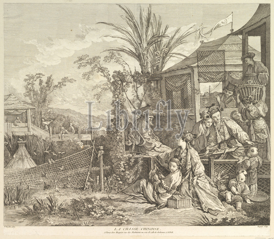 La Chasse Chinoise, Chinese Hunt, Chinoiseries, 1743, Etching, engraving, Sheet, 16 1/2 x 18 7/8, 41.9 48 cm, Jacques Gabriel Huquier, French, Paris, 1730–1805, Shrewsbury, Gabriel, Orléans, 1695–1772, After François Boucher, 1703–1770, Chez, 18th century