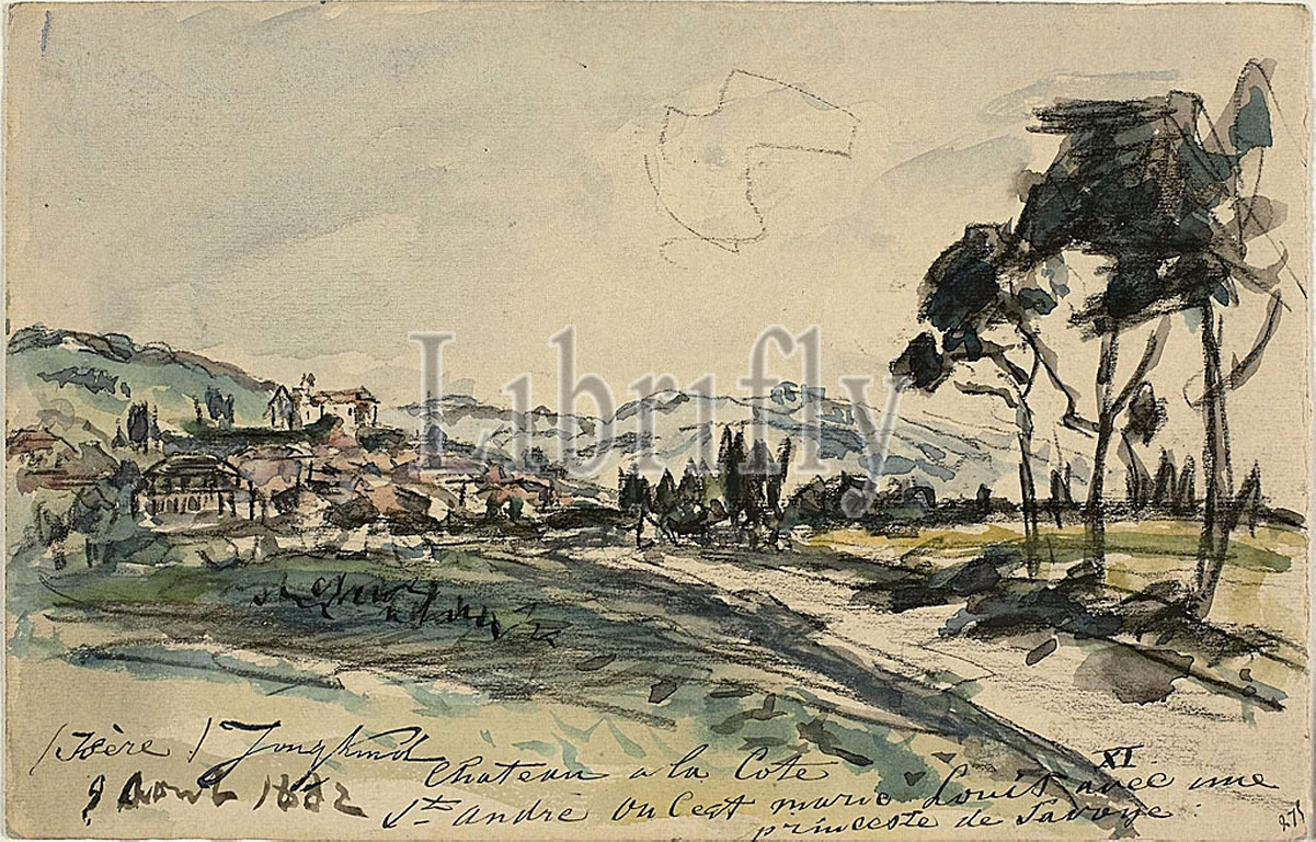 Chateau, Cote Saint Andre (recto) Empty Cart and Shed with Other Sketches (verso), 1882, Johan Barthold Jongkind, Dutch, 1819-1891, Holland, Watercolor, with black conte crayon, on cream wove paper, 155 x 241 mm