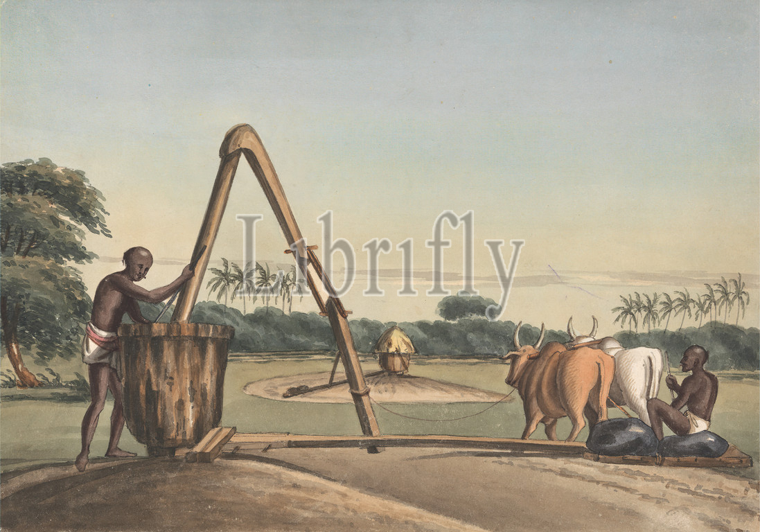 Checkoo, Oil Mill, John Gantz, 1772–1853, 1828, Pen, black ink, watercolor, medium, slighlty textured, cream wove paper mounted, medium, moderately textured, gray wove paper, Sheet, genre subject, grain, mill, milling, oil mill, oxen, worker, India