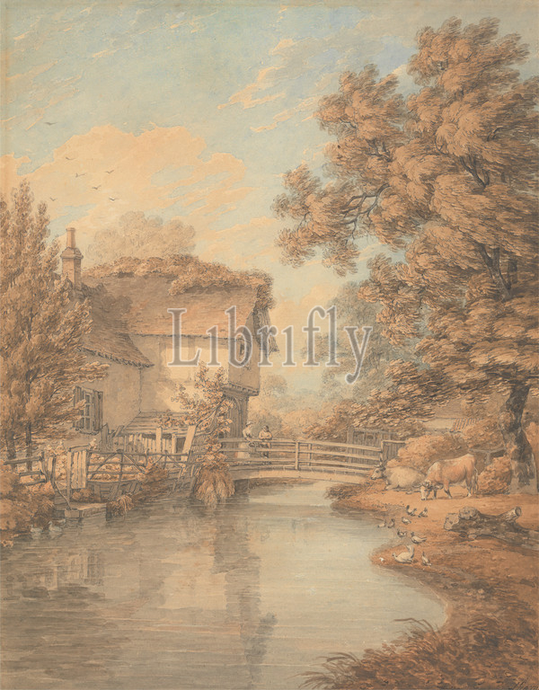 The Cheesecake House, Hyde Park, Thomas Hearne, 1744–1817, British, ca. 1795, Watercolor and graphite on moderately thick, slightly textured, cream wove paper, Sheet: 13 1/8 × 10 1/4 inches (33.3 × 26 cm) and Image: 13 x 10 1/4 inches (33 x 26 cm), architectural subject, birds, bridge (built work), building, chickens, cows, ducks, fences, garden, grazing, groundskeeper's cottage, house, landscape, leisure, man, park (grounds), reflection, river, talking, trees, watching, woman, Cheesecake House, England, Europe, Hyde Park, London, United Kingdom