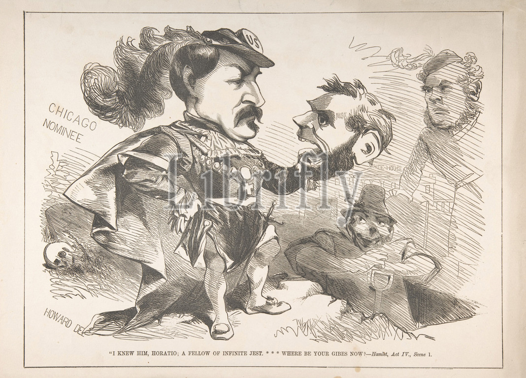 Chicago Nominee: 'I knew him, Horatio; a fellow of infinite jest...Where be your gibes now?–Hamlet, Act IV [sic], Scene 1', 1864, Wood engraving, Sheet: 12 x 16 5/8 in. (30.5 x 42.2 cm), Prints, Justin H. Howard (American, active 1856–80), This biting satire relates to the 1864 American presidential campaign, waged during the Civil War. Democratic nominee General George McClellan is caricatured as Hamlet in the famous graveyard scene in act 5 of Shakespeare’s play