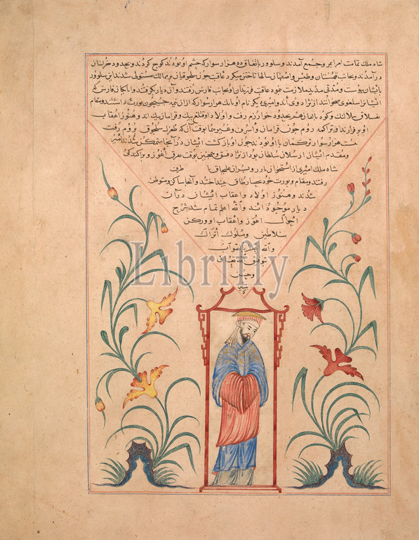 Chinese Emperor Standing, Pavilion, Folio, Majma al-Tavarikh, Compendium, Histories, Hafiz, Abru, ca, 1425, present-day Afghanistan, Herat, Ink, opaque watercolor, gold, paper, Image 9, x 13 1/4, Codices, Written, court historian Hafiz, modelled, Ilkhanid Jami, al-Tavarikh, text, begins, time, Adam, continues, rule, Shah Rukh, r, 1405–47