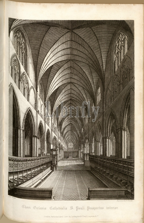 Choir of the Cathedral of St. The interior prospect Paul, Choir of Old St Paul's Cathedral in London, signed: After Hollar; Engraved by W. Find; Published by Lackington & Co. and Longman & Co., Pl. XLIII, at p. 108, Hollar, Wenzel (drawing); Finden, W. (engraving); Lackington & Co (publ.); Longman & Co. (publ.), William Dugdale, Henry Ellis: The history of Saint Paul's Cathedral in London, from its foundation: extracted out of original charters, records, leiger-books, and other manuscripts. London: printed for Lackington, Hughes, Harding, Mavor, and Jones; and Longman, Hurst, Rees, Orme, and Brown, 1818