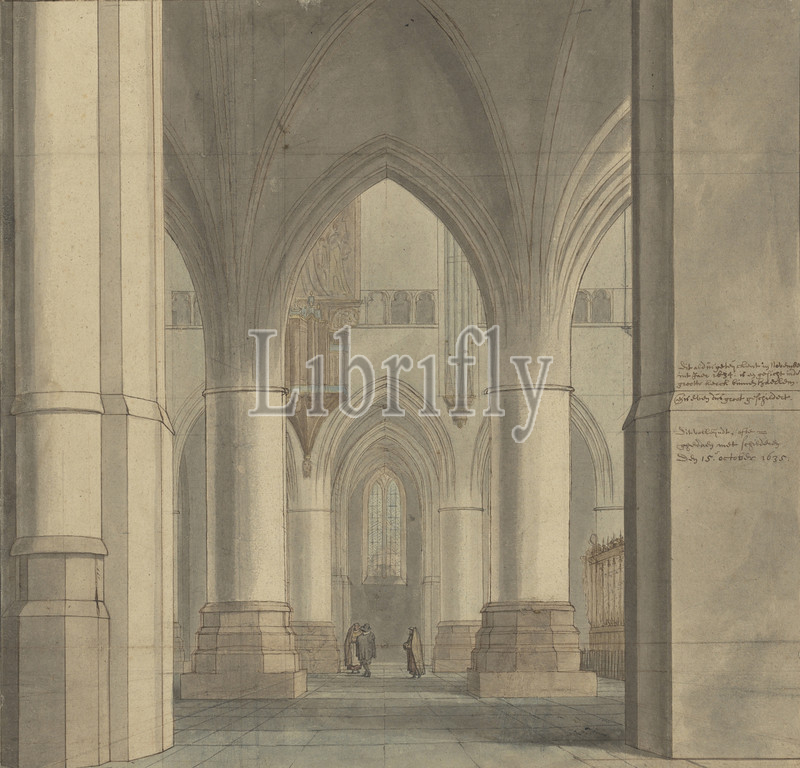 The Choir and North Ambulatory of the Church of Saint Bavo, Haarlem, Pieter Jansz. Saenredam (Dutch, 1597 - 1665), Netherlands, November 1634, Red chalk, graphite, pen and brown ink, and watercolor, incised for transfer (recto), Rubbed with black chalk for transfer (verso), 37.6 x 39.2 cm (14 13/16 x 15 7/16 in.)