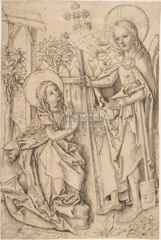Christ Appearing, Mary Magdalen, ca, 1490, Pen, brown ink, brush, wash, black chalk, 9 7/8 x 6 5/8, 25.1 16.8 cm, Drawings, Master of the Drapery Studies, German, Strasbourg, ca., 1470–1500, artist nicknamed, Master, Coburg Roundels, yet, identified, name, clear, surviving stained-glass windows, drawings, critical figure, Upper Rhenish, art, last quarter, fifteenth century, history, early German, drawing, general