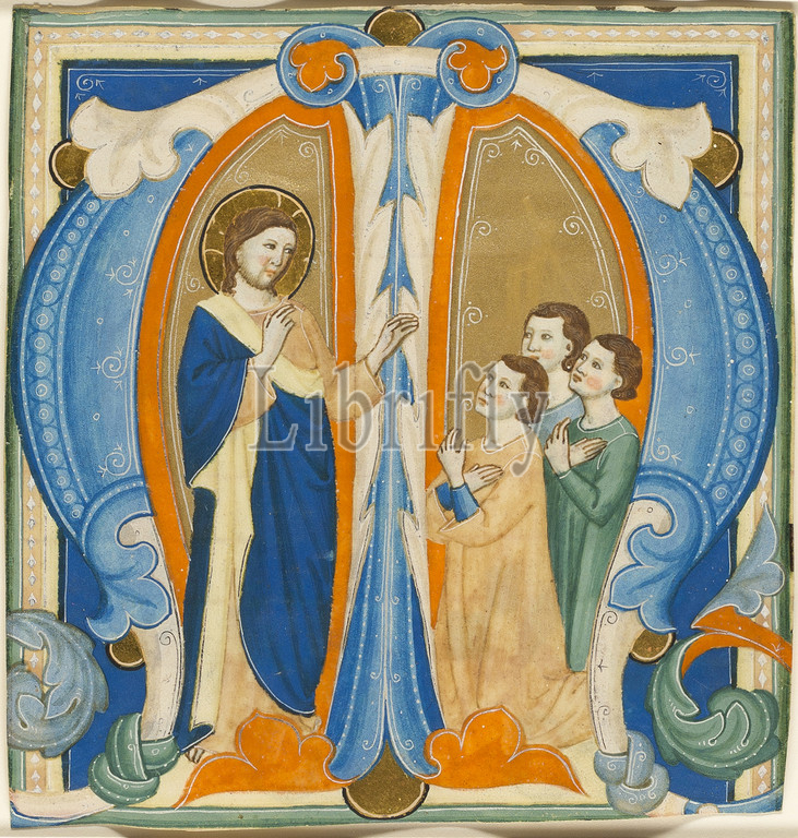 Christ Blessing Three Young Men, initial M from a Gradual, 1320/30, Maestro Daddesco, Italian (Florence), active about 1310-1350, Italy, Opaque watercolor, with shell gold and gold leaf, on parchment, 138 x 131 mm