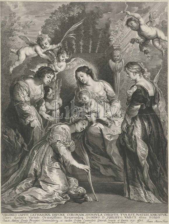Christ child crowns St. Catherine, Mary, Christ child, lap, seated, throne decorated, foliage, arbor, Christ crowns St. Catherine kneeling, right stands, Apollonia, attributes, hand, martyr's palm, pincers, left stands St. Margaret, dragon, leash, Next, angel, bundle, lightning bolts, margin, three-line caption, Latin, Madonna, Mary sitting, enthroned, Christ-child, sometimes, front, bosom, virgin martyr Apollonia, Alexandria, possible attributes, book, crown, palm-branch, tooth, virgin martyr Margaret, Antioch, cross, under feet, chain, chaplet, pearls, virgin martyr Catherine, emperor Maxentius, ring, sword, wheel, female saint, confirmation, Order, approval, Rule, s, Pieter de Jode, I, mentioned, object, Antwerp, 1590, 1632, paper, engraving