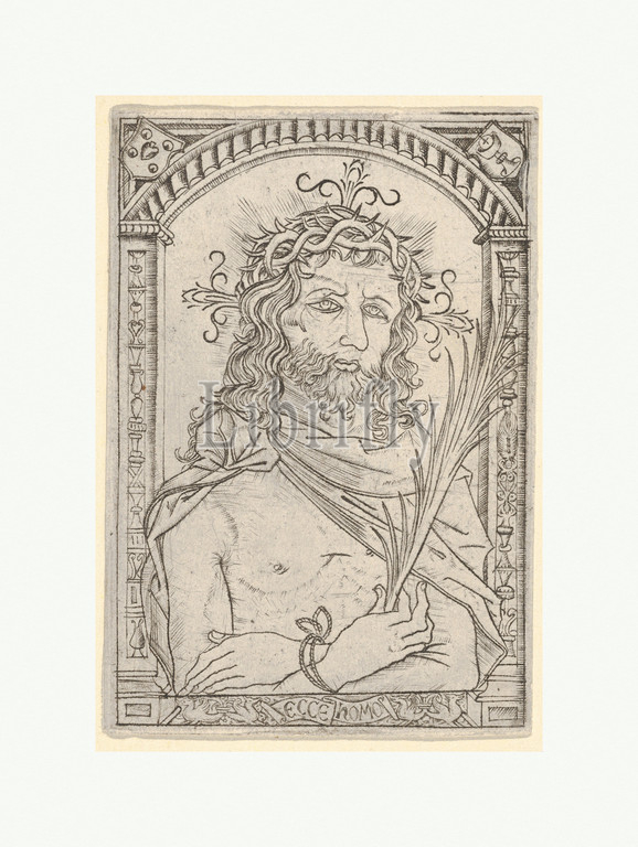 Christ as the man of sorrows set within an ornate frame, ca. 1500–1520, Engraving, Sheet: 3 3/4 x 2 5/8 in. (9.6 x 6.7 cm), Prints, Attributed to Nicoletto da Modena (Italian, Modena, active ca. 1500–ca. 1520), Written on the mat on which it came to the MMA: 'Flemish. School of Israel van Meckenem. Based on - and similar to - Meckenem's Man of Sorrows. Very Rare and Fine. Ca. 1500'