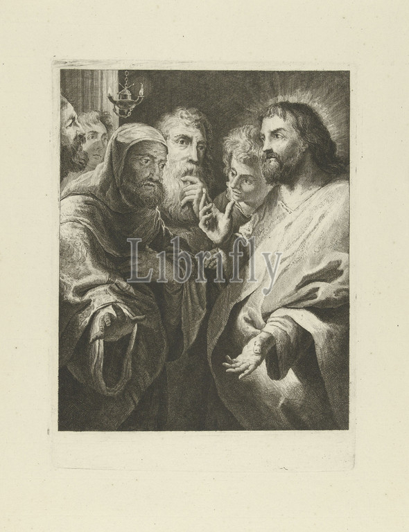Christ and Nicodemus, Christ in conversation with Nicodemus, by candlelight. Behind them four figures., Christ talking with Nicodemus at night (John 3: 1-21), Jan Lauwryn Krafft (I), Southern Netherlands, 1704 - 1765, paper, engraving, h 311 mm × w 232 mm