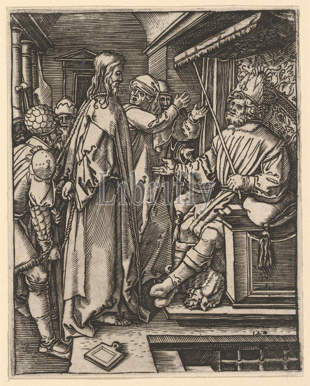 Christ standing, hands tied, back, Herod seated, throne, Dürer, ca, 1500–1534, Engraving, second state, three, Sheet, 5 1/16, 4, 12.8, 10.2 cm, Prints, Marcantonio Raimondi, Italian, Argini, ca., 1480–before, 1534, Bologna, After Albrecht Dürer, German, Nuremberg, 1471–1528