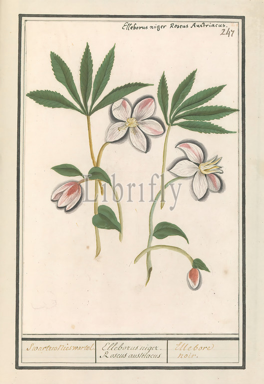 Christmas rose, Helleborus niger, Swarten sneeze root, Elleborus niger, Roseus austriacus, Ellebore noir, title, object, Helleborus, Numbered top right, 247, Top left, Latin name, Part, third album, drawings, flowers, plants, Tenth, twelve albums, animals, birds, 1600, commissioned, Emperor Rudolf II, explanation, Dutch, Latin, French, Anselmus Boetius de Boodt, 1596, 1610, paper, watercolor, paint, deck paint, chalk, ink, pen