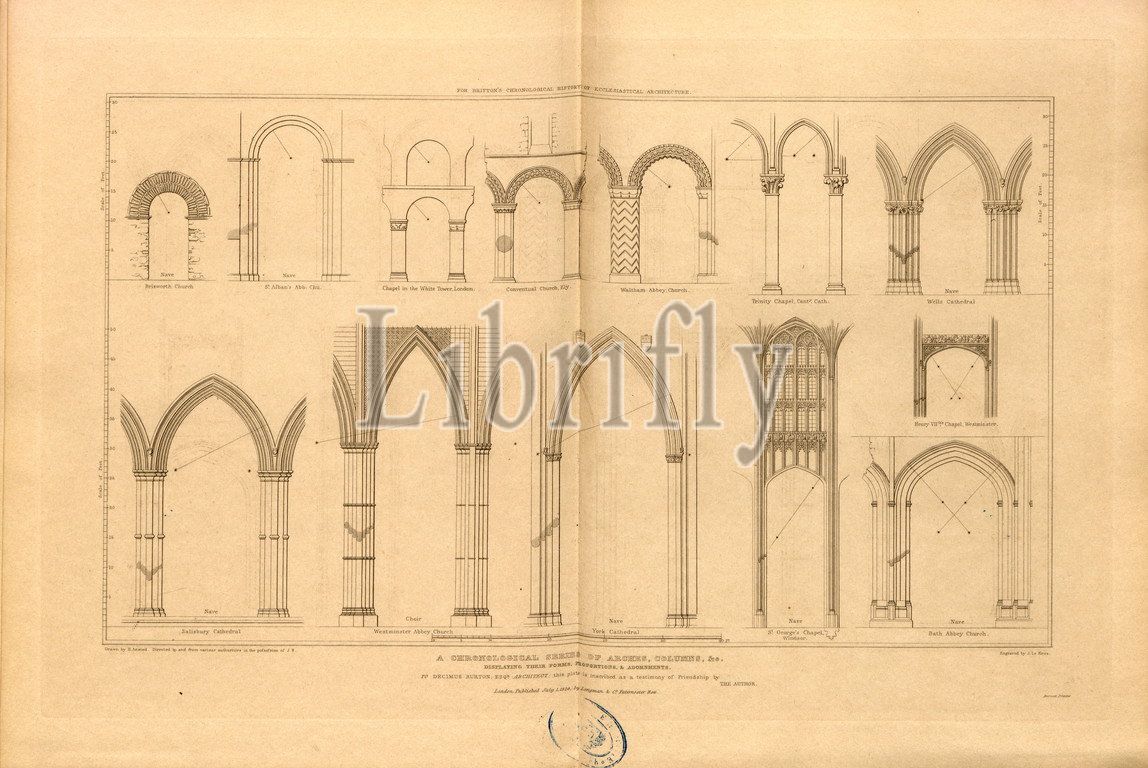 A chronological series of arches, columns, Various types of arch and columns in churches, signed: Drawn b H. Ansted; Directed by J. B, Engraved by J. Le Keux; Published by Longman & Co, Fig. 79, after p. 260, Britton, John (direction); Ansted, H. (drawing); Keux, John Le (engraving); Longman & Co. (published), 1826, John Britton: The architectural antiquities of Great Britain: represented and illustrated in a series of views, elevations, plans, sections and details of various ancient English edifices: with historical and descriptive accounts of each. Bd. 5. London: J. Taylor, 1807-1826