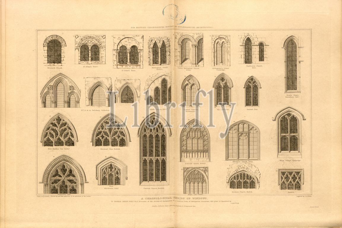 A chronological series of windows, Various stained-glass windows, signed: Drawn b H. Ansted; Directed by J. B, Engraved by J. Le Keux; Published by Longman & Co, Fig. 80, after p. 260, Britton, John (direction); Ansted, H. (drawing); Keux, John Le (engraving); Longman & Co. (published), 1826, John Britton: The architectural antiquities of Great Britain: represented and illustrated in a series of views, elevations, plans, sections and details of various ancient English edifices: with historical and descriptive accounts of each. Bd. 5. London: J. Taylor, 1807-1826